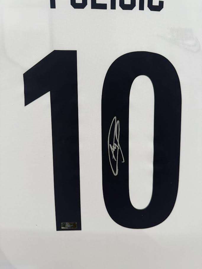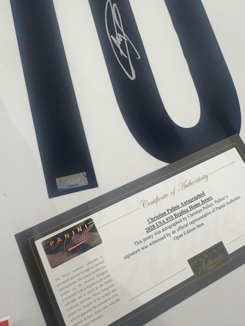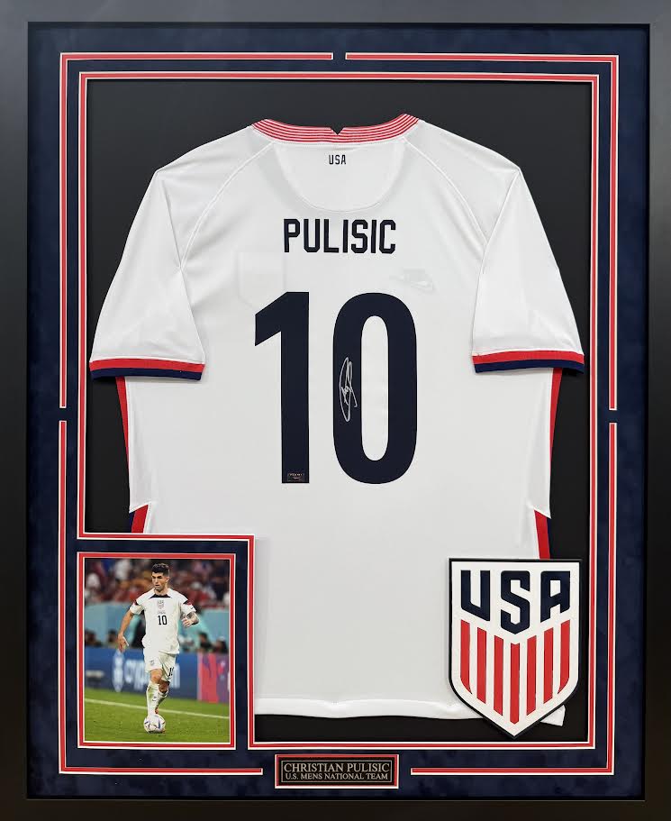 Christian Pulisic Autographed Hand Signed Custom Framed United States Men's National Team Jersey, authenticated by Panini. This jersey is masterfully framed as the jersey is hand sewn rather than glued or stapled to ensure the jersey is not damaged in any way during the framing process. All of our materials are museum quality and acid free, not just cheap acid buffered paper matting. The suede matting, color combo, and white bevels really make this jersey POP like few jersey framings do! Feel free to reach out with any questions!