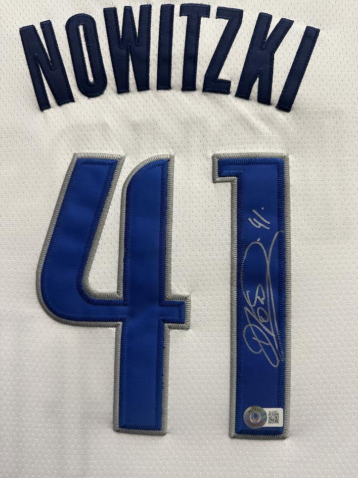 Dirk Nowitzki Autographed Hand Signed Custom Framed Dallas Mavericks Jersey, authenticated by Beckett. This jersey is masterfully framed as the jersey is hand sewn rather than glued or stapled to ensure the jersey is not damaged in any way during the framing process. All of our materials are museum quality and acid free, not just cheap acid buffered paper matting. The suede matting, color combo, and white bevels really make this jersey POP like few jersey framings do! Feel free to reach out with any questions!