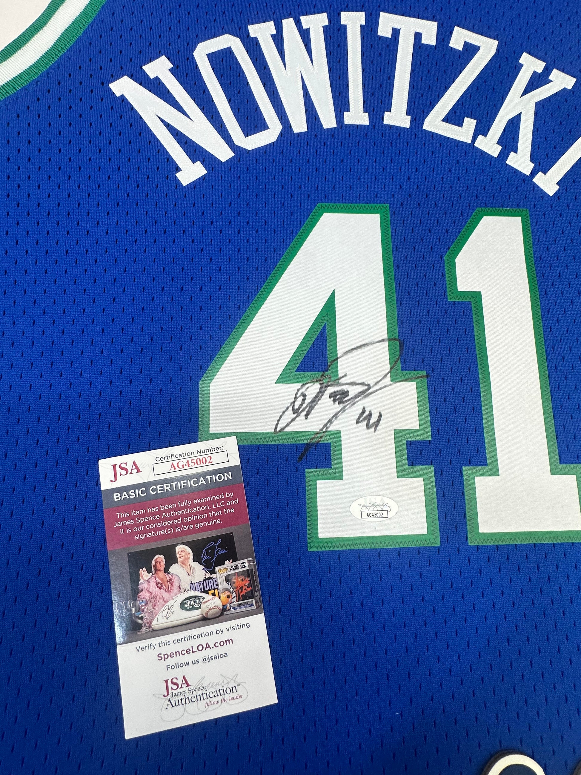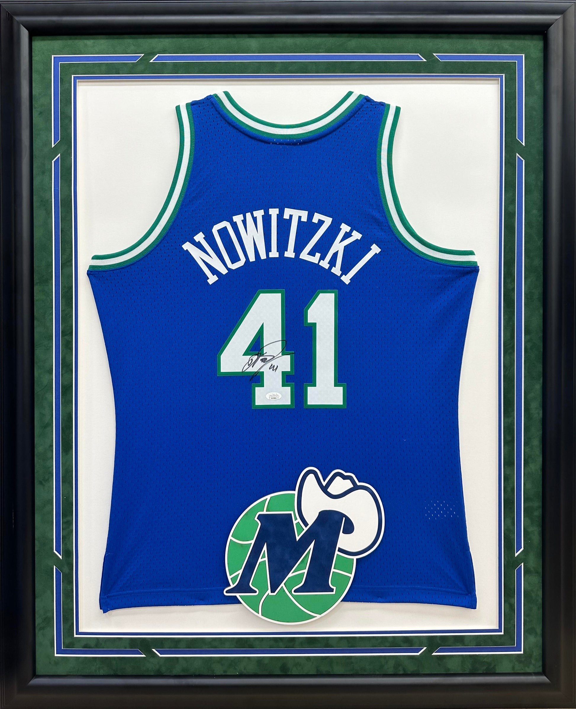 Dirk Nowitzki Autographed Hand Signed Custom Framed Throwback Dallas Mavericks Jersey, authenticated by JSA. This jersey is masterfully framed as the jersey is hand sewn rather than glued or stapled to ensure the jersey is not damaged in any way during the framing process. All of our materials are museum quality and acid free, not just cheap acid buffered paper matting. The suede matting, color combo, and white bevels really make this jersey POP like few jersey framings do! Feel free to reach out with any questions!