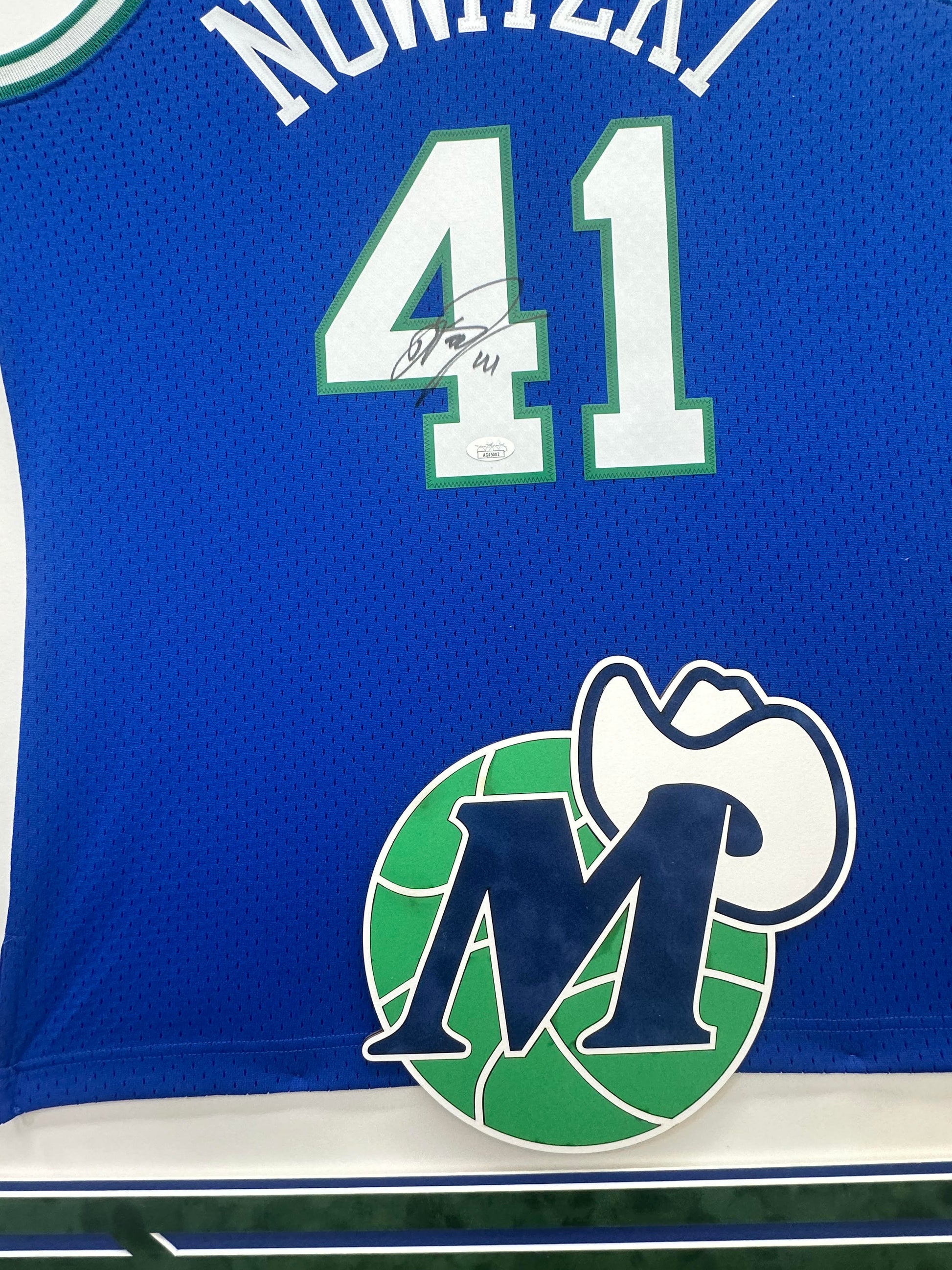 Dirk Nowitzki Autographed Hand Signed Custom Framed Throwback Dallas Mavericks Jersey - JSA COA