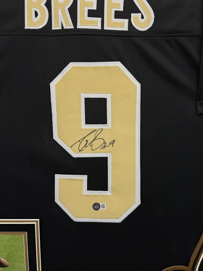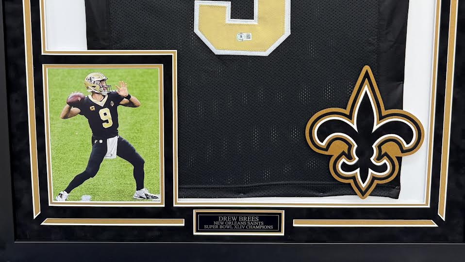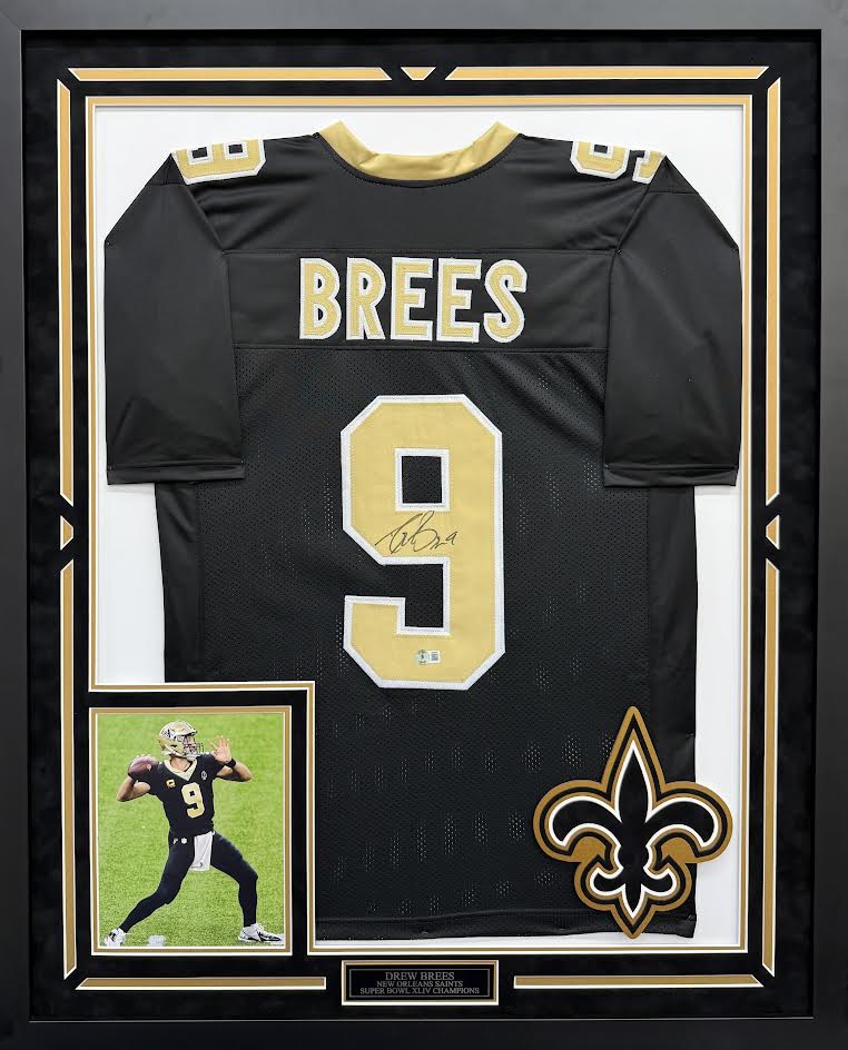 Drew Brees Autographed Hand Signed Custom Framed New Orleans Saints Jersey, certified by Beckett. This jersey is masterfully framed as the jersey is hand sewn rather than glued or stapled to ensure the jersey is not damaged in any way during the framing process. All of our materials are museum quality and acid free, not just cheap acid buffered paper matting. The suede matting, color combo, and white bevels really make this jersey POP like few jersey framings do! Feel free to reach out with any questions!