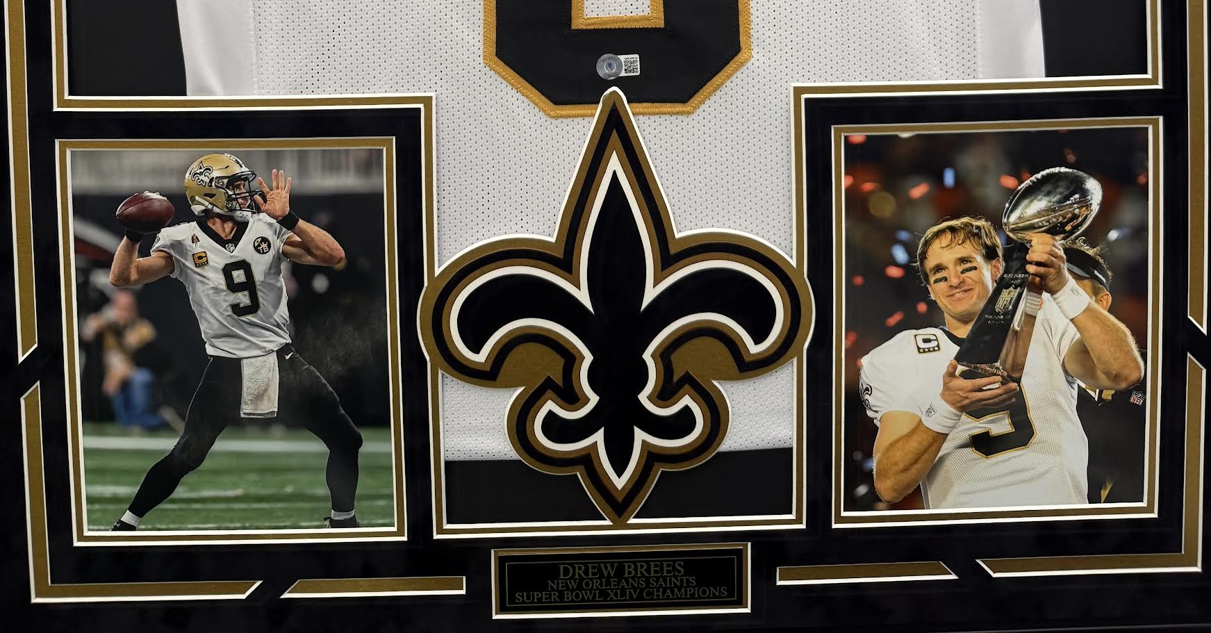 Drew Brees Autographed Hand Signed Custom Framed New Orleans Saints Jersey, certified by Beckett. This jersey is masterfully framed as the jersey is hand sewn rather than glued or stapled to ensure the jersey is not damaged in any way during the framing process. All of our materials are museum quality and acid free, not just cheap acid buffered paper matting. The suede matting, color combo, and white bevels really make this jersey POP like few jersey framings do! Feel free to reach out with any questions!