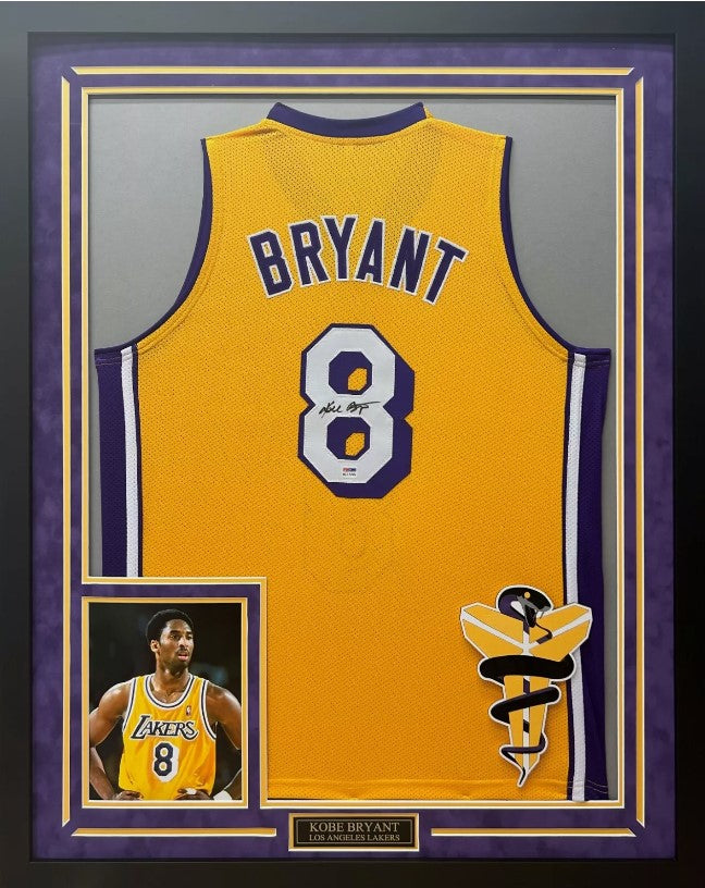 Kobe Bryant Autographed Hand Signed Custom Framed LA Lakers #8 Jersey (Custom Mamba Logo), authenticated by PSA/DNA. This jersey is masterfully framed as the jersey is hand sewn rather than glued or stapled to ensure the jersey is not damaged in any way during the framing process. All of our materials are museum quality and acid free, not just cheap acid buffered paper matting. The suede matting, color combo, and white bevels really make this jersey POP like few jersey framings do! Feel free to reach out with any questions!