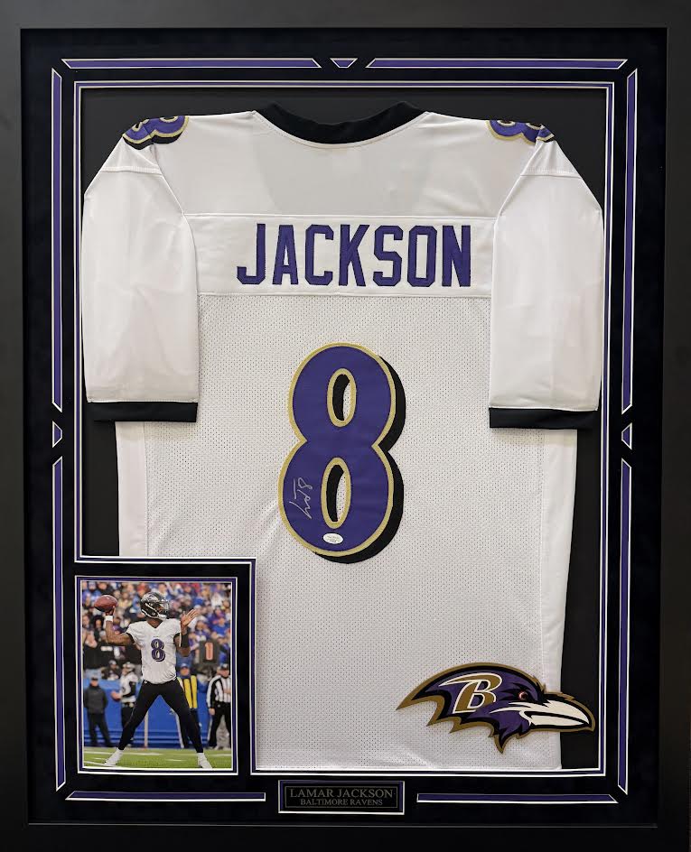 Lamar Jackson Autographed Hand Signed Custom Framed Baltimore Ravens Jersey, authenticated by JSA. This jersey is masterfully framed as the jersey is hand sewn rather than glued or stapled to ensure the jersey is not damaged in any way during the framing process. All of our materials are museum quality and acid free, not just cheap acid buffered paper matting. The suede matting, color combo, and white bevels really make this jersey POP like few jersey framings do! Feel free to reach out with any questions!