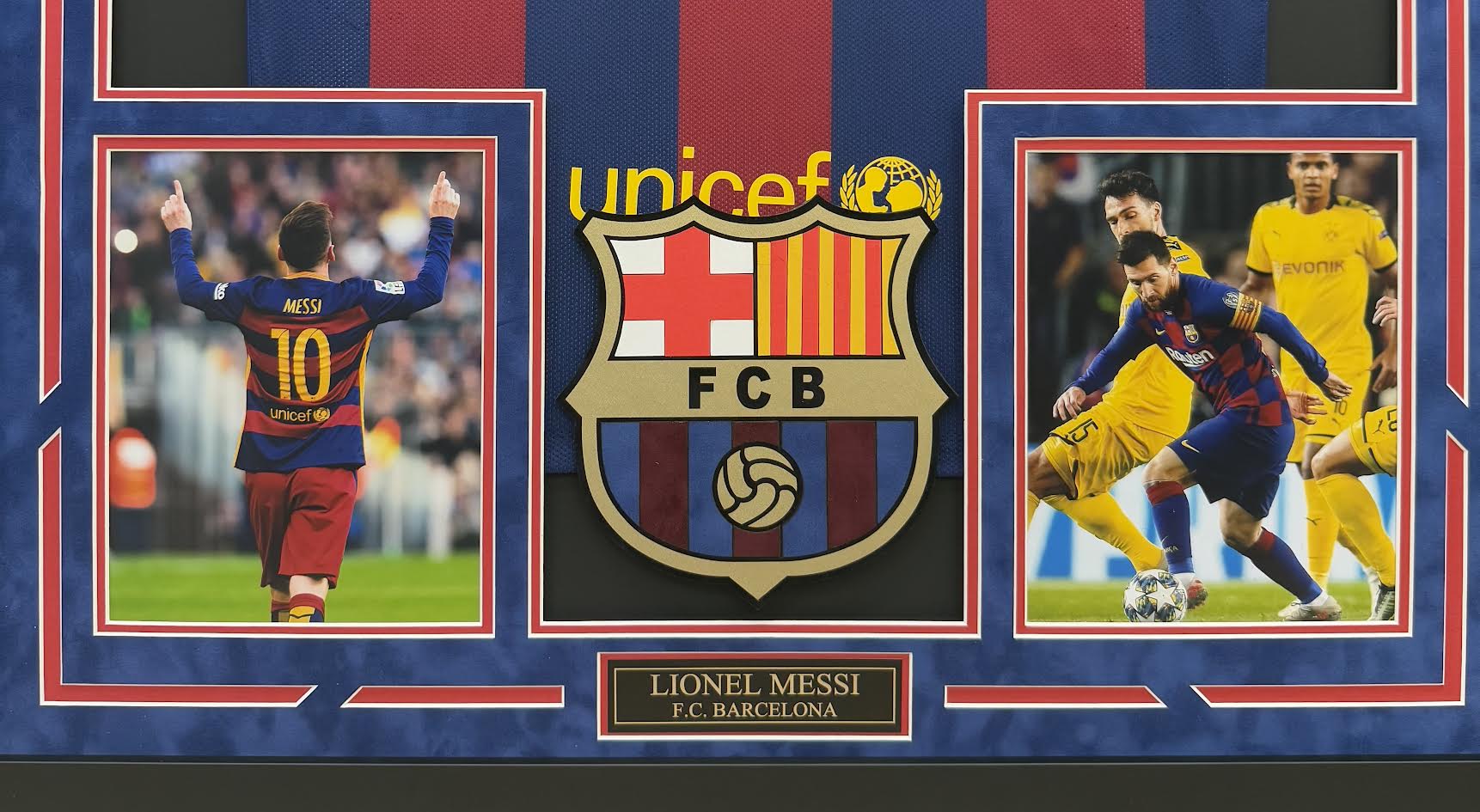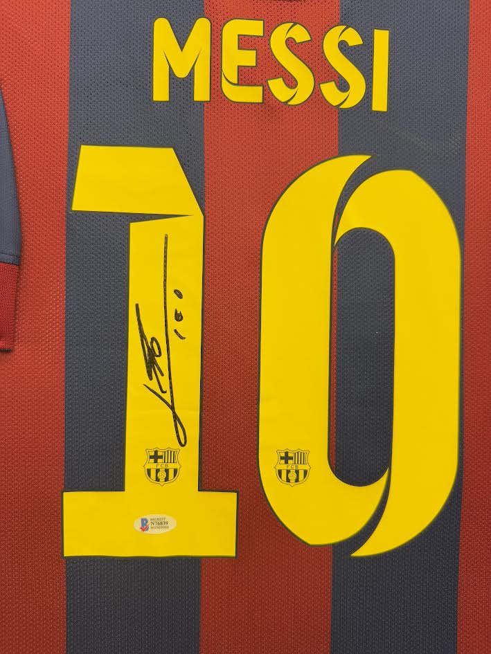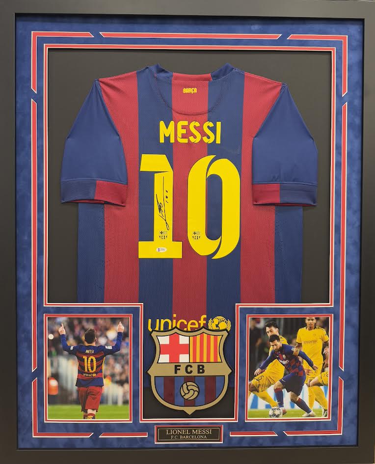 Lionel Messi Autographed Hand Signed Custom Framed Jersey, authenticated by Beckett. This jersey is masterfully framed as the jersey is hand sewn rather than glued or stapled to ensure the jersey is not damaged in any way during the framing process. All of our materials are museum quality and acid free, not just cheap acid buffered paper matting. The suede matting, color combo, and white bevels really make this jersey POP like few jersey framings do! Feel free to reach out with any questions!