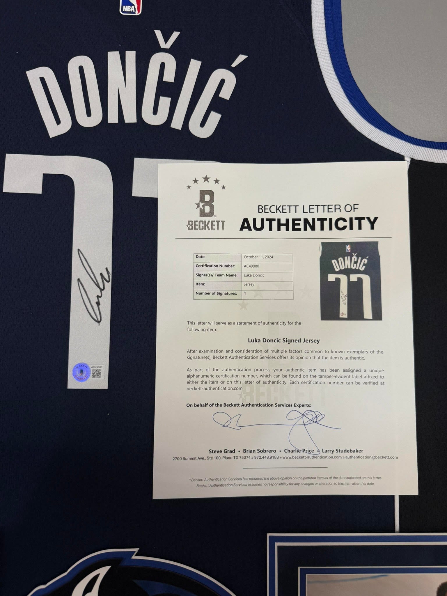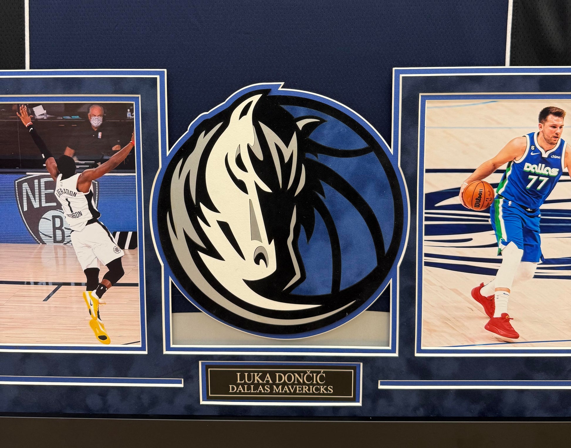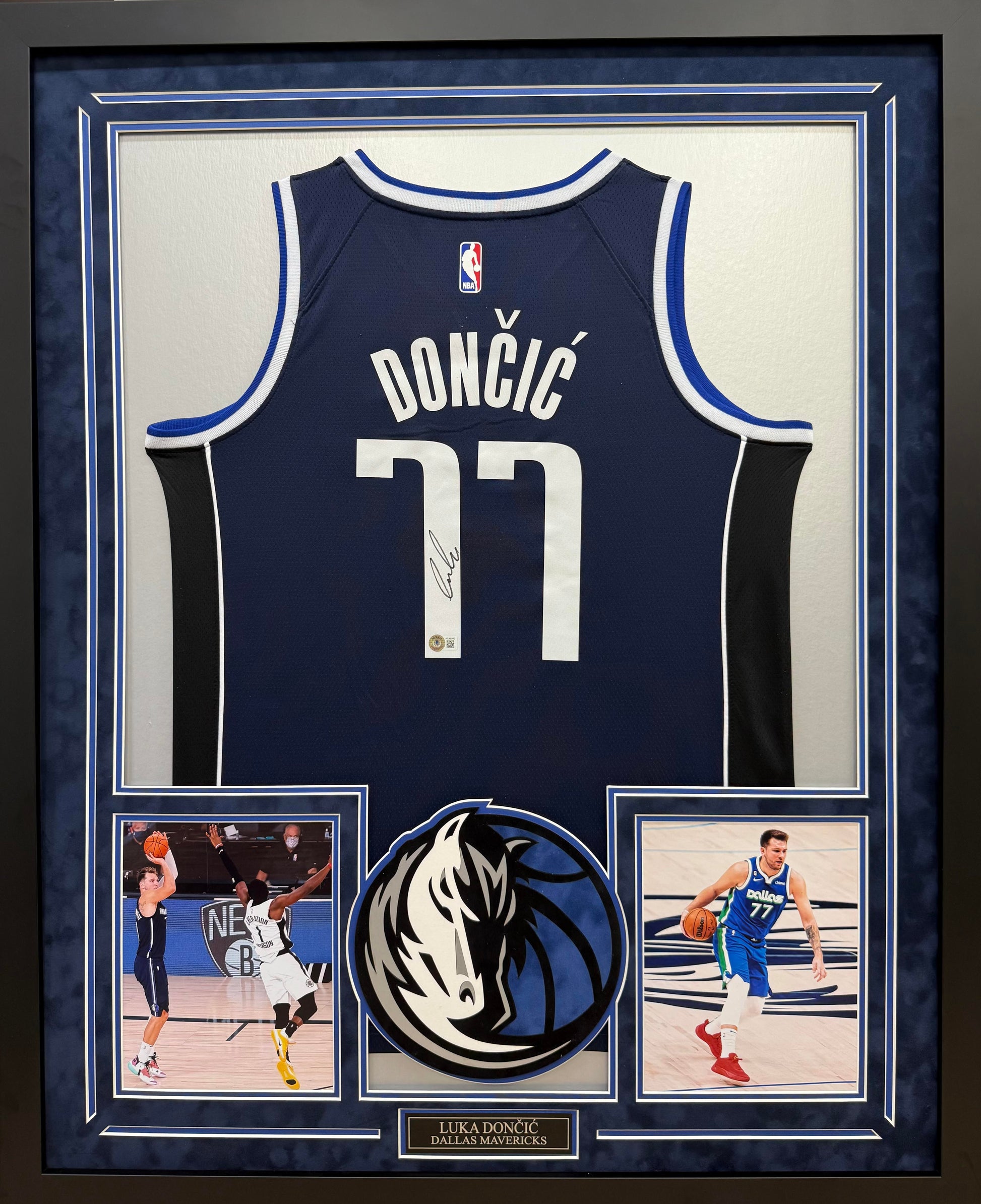 Luka Doncic Autographed Hand Signed Custom Framed Dallas Mavericks Jersey, authenticated by Beckett. This jersey is masterfully framed as the jersey is hand sewn rather than glued or stapled to ensure the jersey is not damaged in any way during the framing process. All of our materials are museum quality and acid free, not just cheap acid buffered paper matting. The suede matting, color combo, and white bevels really make this jersey POP like few jersey framings do! Feel free to reach out with any questions!
