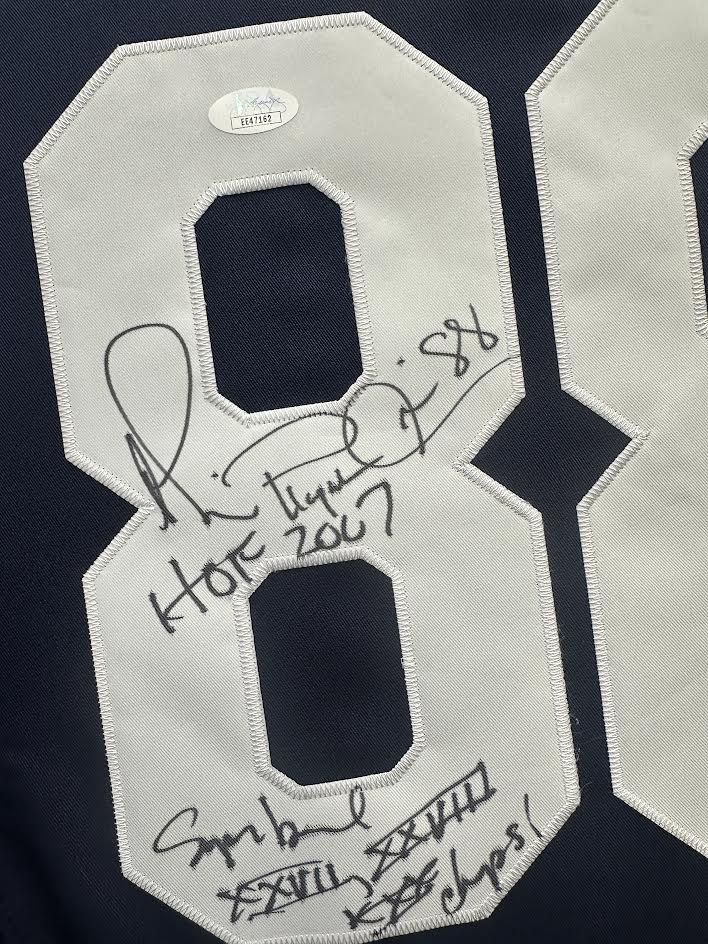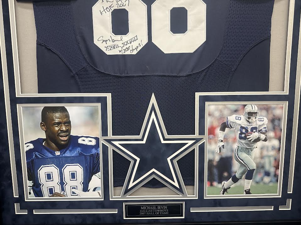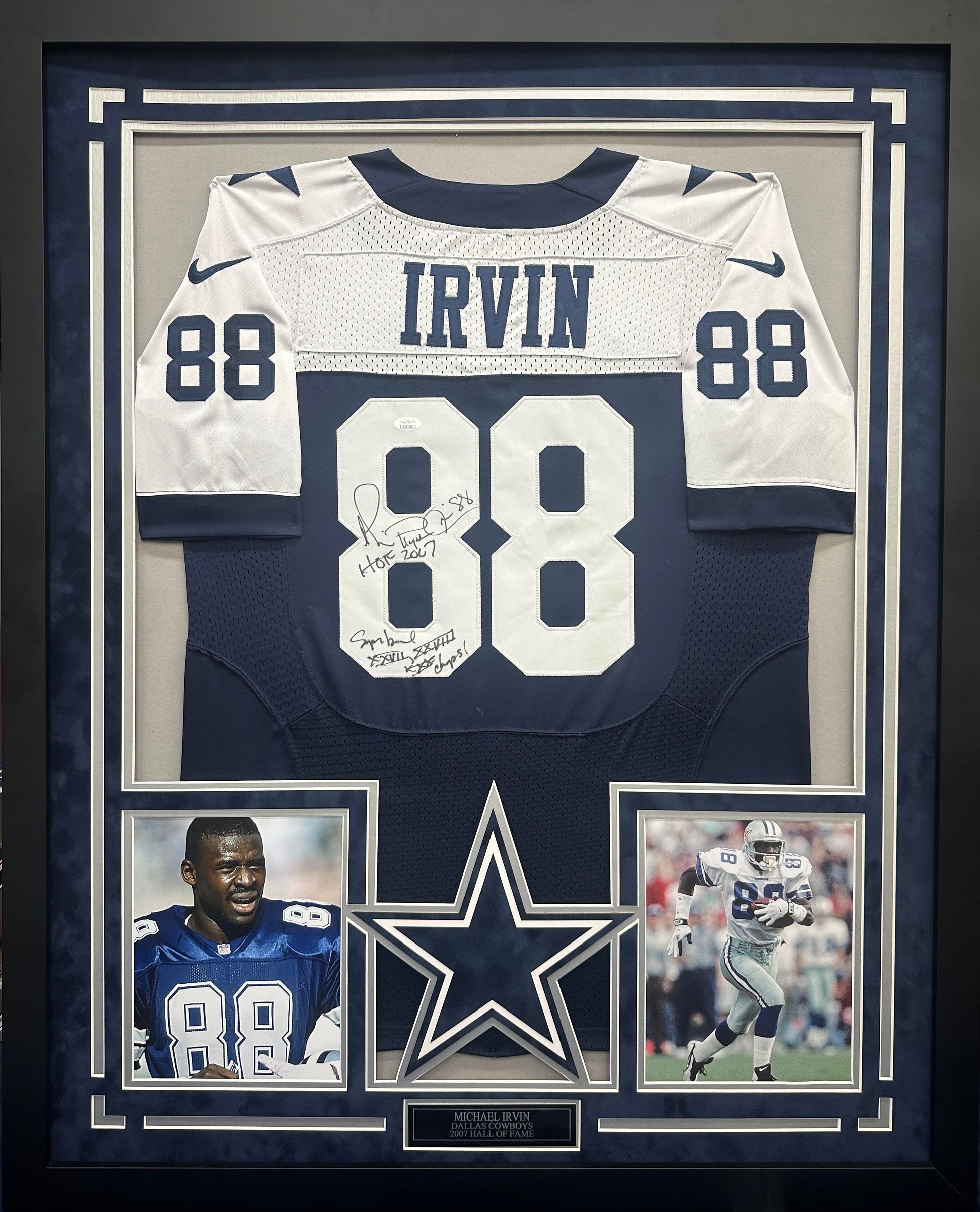 Michael Irvin Autographed Hand Signed Custom Framed Dallas Cowboys Jersey, authenticated by JSA. This jersey is masterfully framed as the jersey is hand sewn rather than glued or stapled to ensure the jersey is not damaged in any way during the framing process. All of our materials are museum quality and acid free, not just cheap acid buffered paper matting. The suede matting, color combo, and white bevels really make this jersey POP like few jersey framings do! Feel free to reach out with any questions! This autograph also boasts 2 different inscriptions: