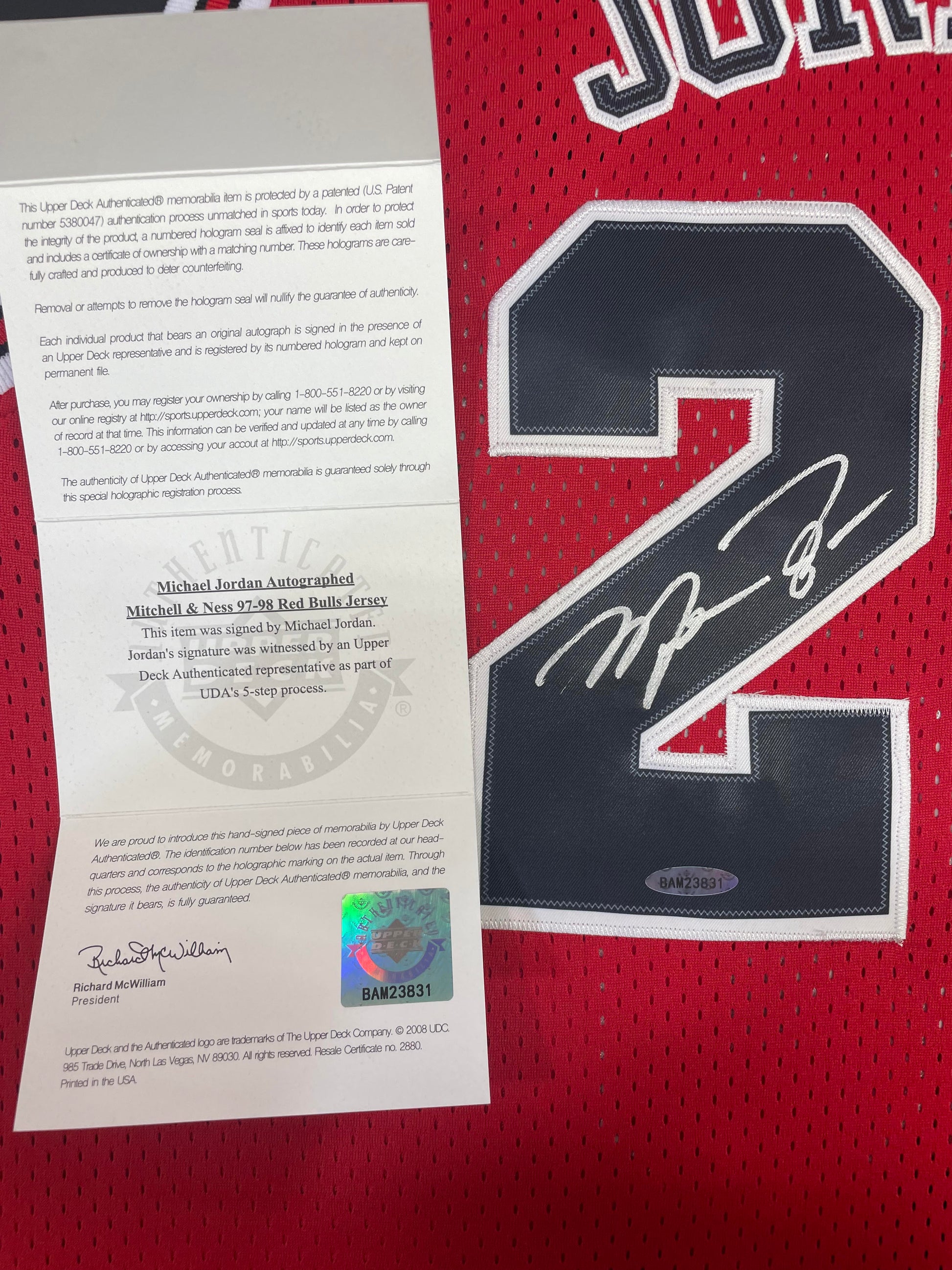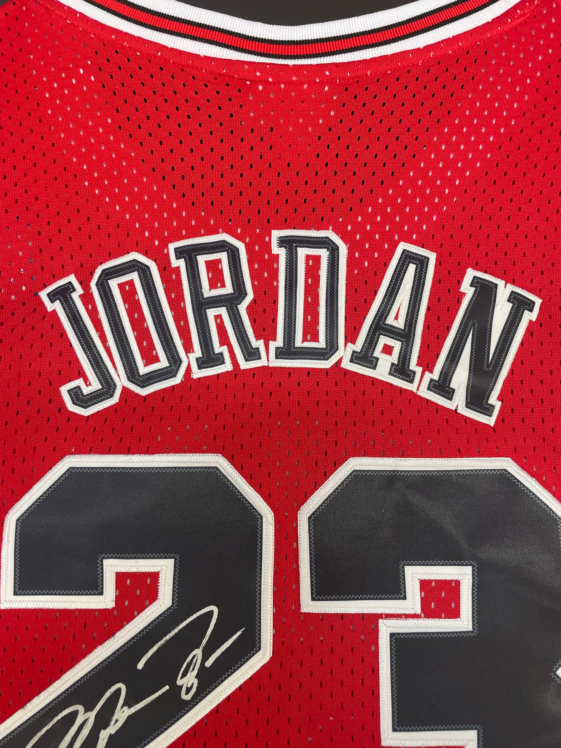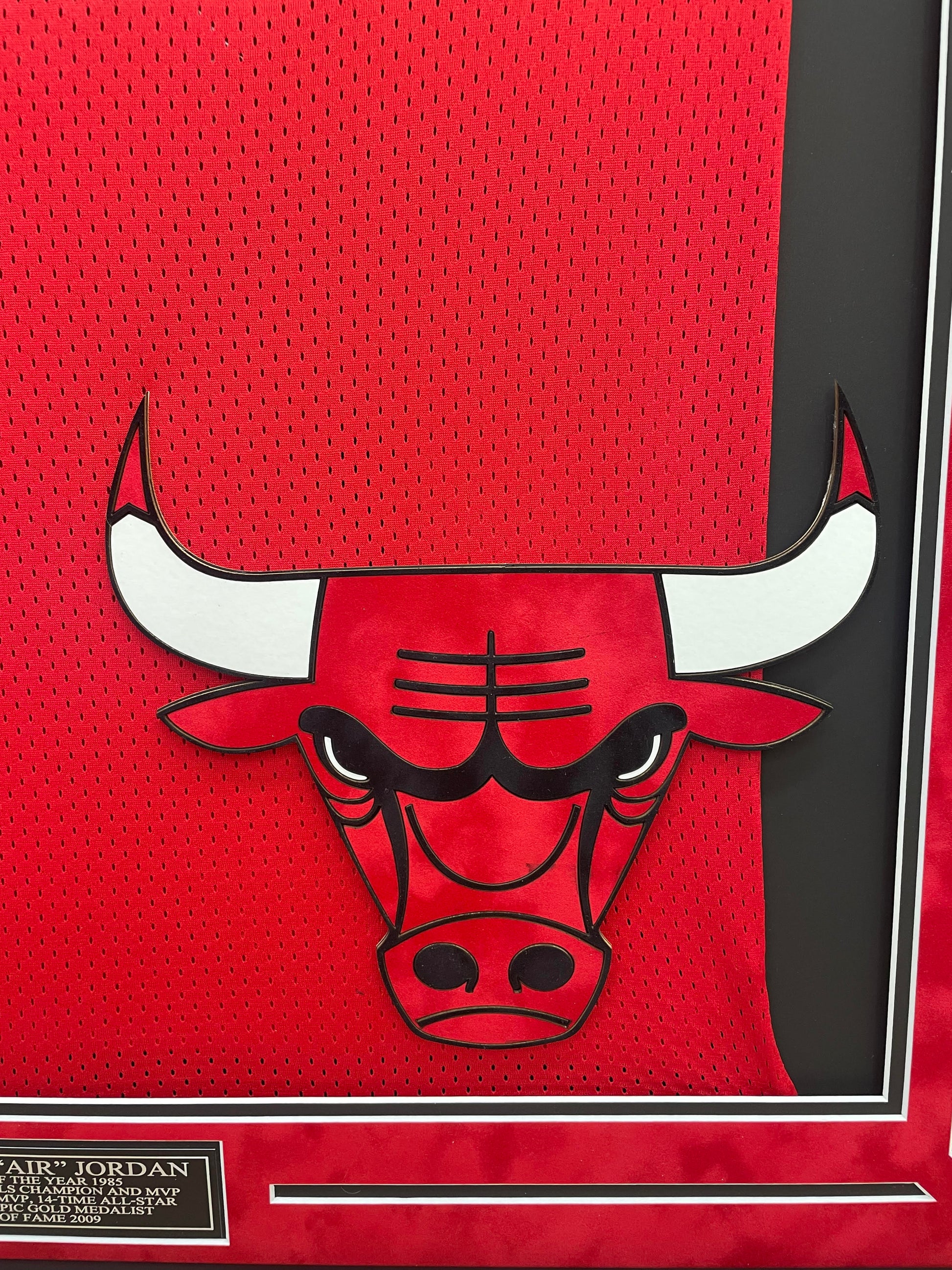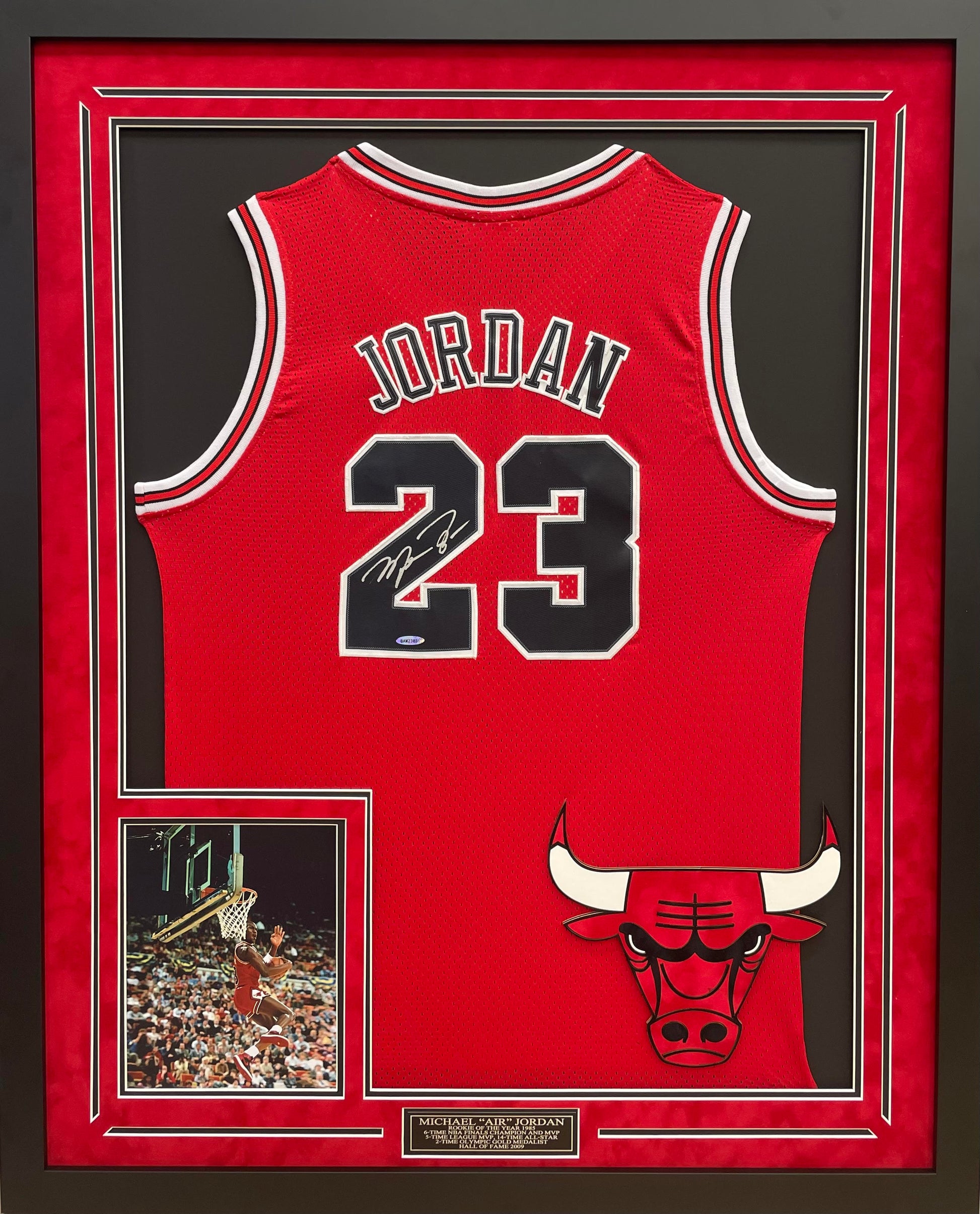 Michael Jordan Autographed Hand Signed Custom Framed Chicago Bulls Jersey, certified by Upper Deck. This jersey is masterfully framed as the jersey is hand sewn rather than glued or stapled to ensure the jersey is not damaged in any way during the framing process. All of our materials are museum quality and acid free, not just cheap acid buffered paper matting. The suede matting, color combo, and white bevels really make this jersey POP like few jersey framings do! Feel free to reach out with any questions!