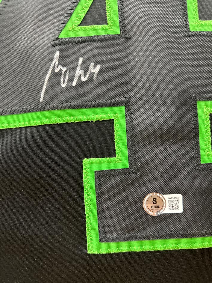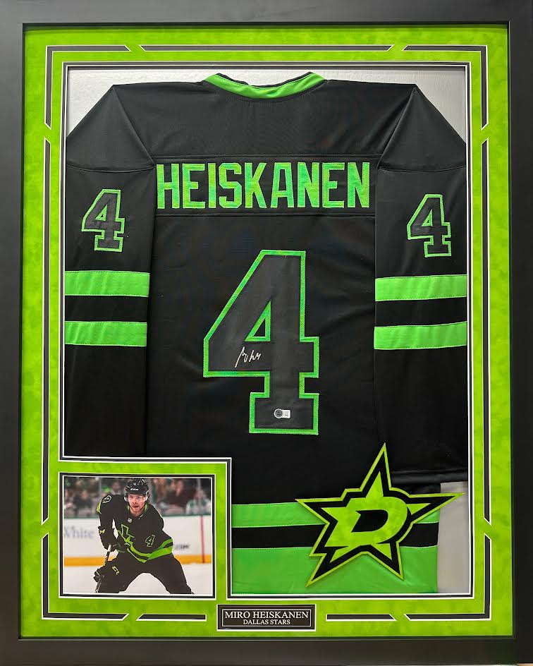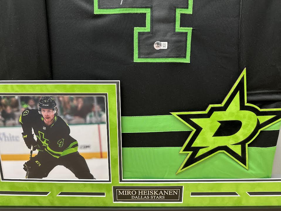 Miro Heiskanen Autographed Hand Signed Custom Framed Dallas Stars Jersey, authenticated by Beckett. This jersey is masterfully framed as the jersey is hand sewn rather than glued or stapled to ensure the jersey is not damaged in any way during the framing process. All of our materials are museum quality and acid free, not just cheap acid buffered paper matting. The suede matting, color combo, and white bevels really make this jersey POP like few jersey framings do! Feel free to reach out with any questions!