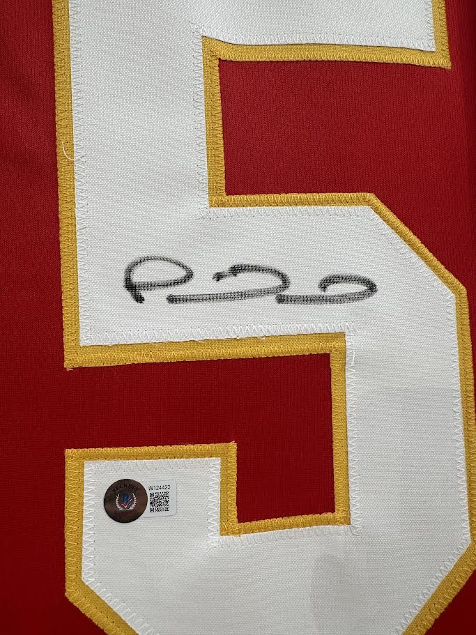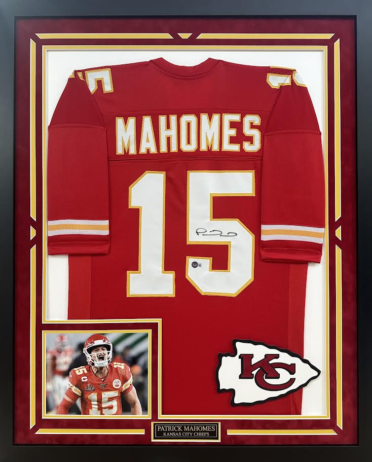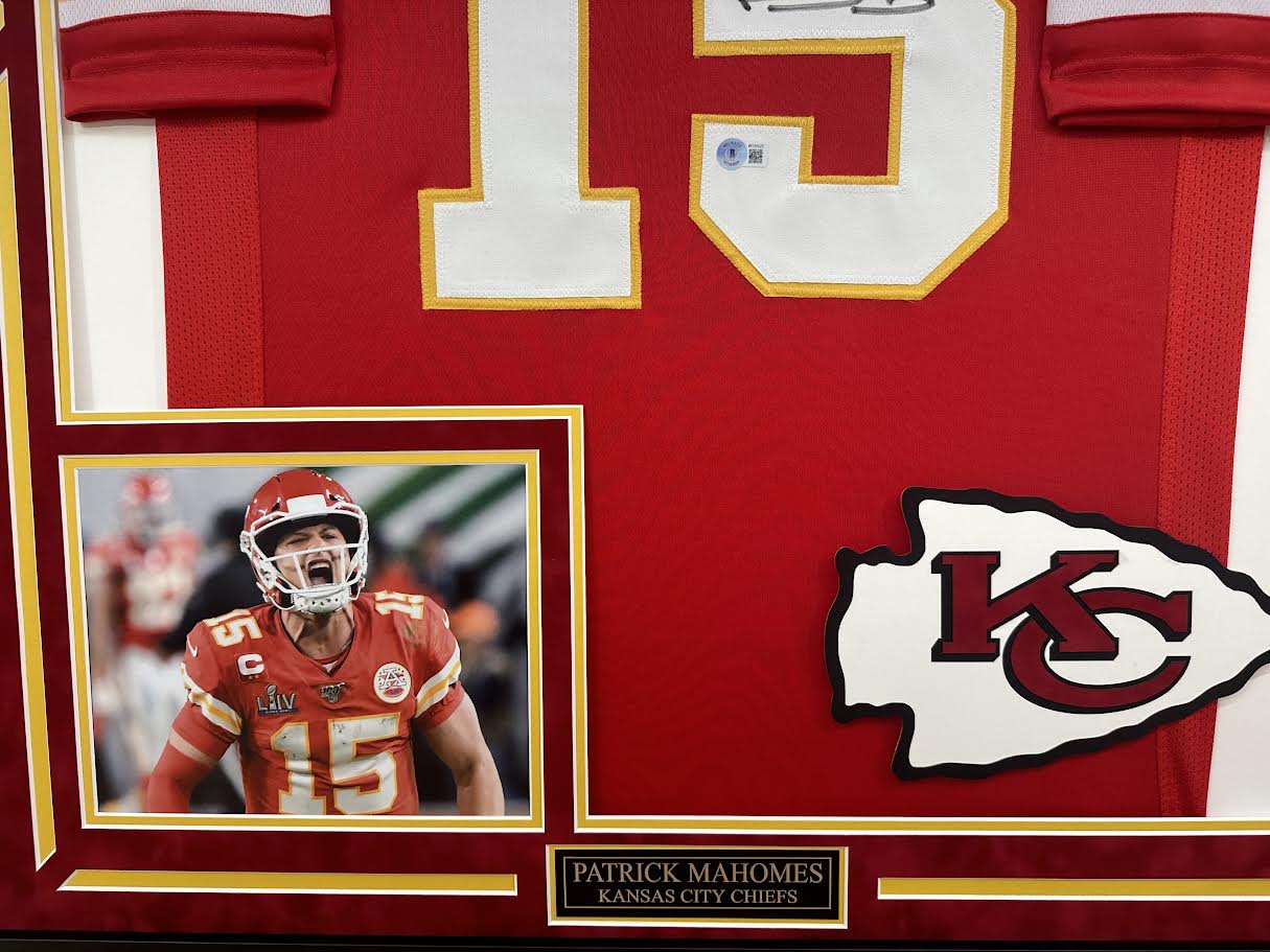 Patrick Mahomes Autographed Hand Signed Custom Framed Kansas City Chiefs Jersey, authenticated by a Beckett hologram. This jersey is masterfully framed as the jersey is hand sewn rather than glued or stapled to ensure the jersey is not damaged in any way during the framing process. All of our materials are museum quality and acid free, not just cheap acid buffered paper matting. The suede matting, color combo, and white bevels really make this jersey POP like few jersey framings do! Feel free to reach out with any questions!