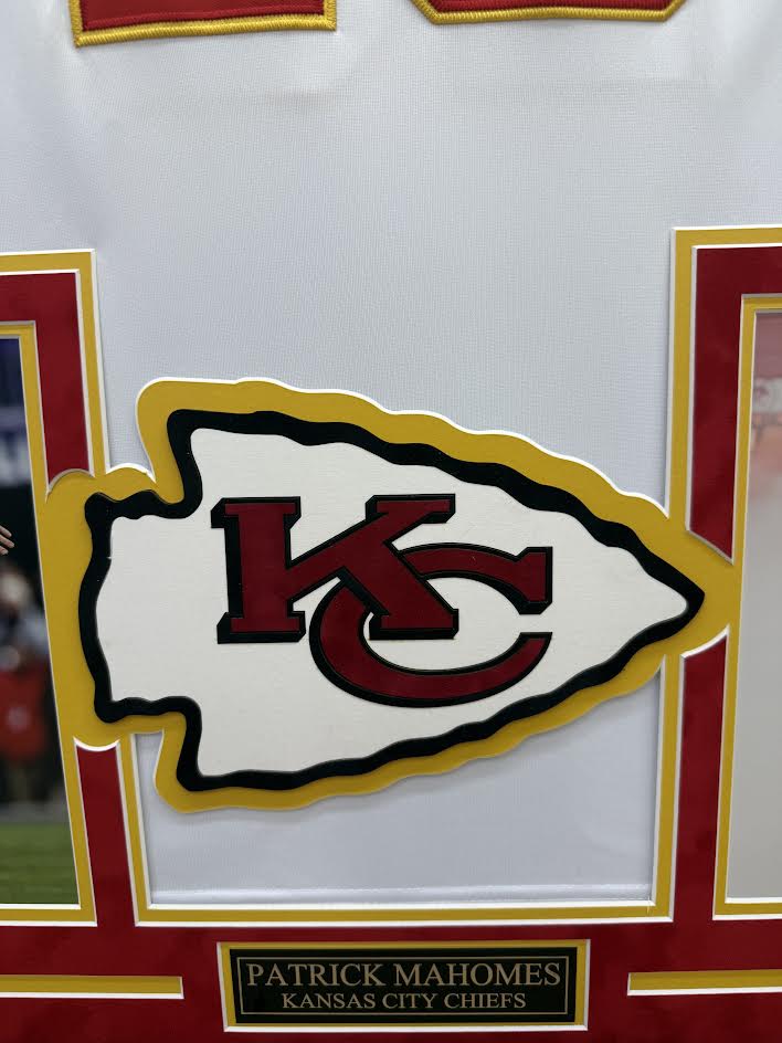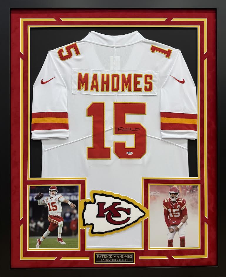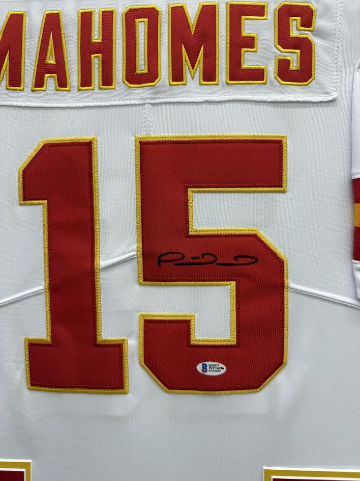 Patrick Mahomes Autographed Hand Signed Custom Framed Kansas City Chiefs Jersey, authenticated by Beckett. This jersey is masterfully framed as the jersey is hand sewn rather than glued or stapled to ensure the jersey is not damaged in any way during the framing process. All of our materials are museum quality and acid free, not just cheap acid buffered paper matting. The suede matting, color combo, and white bevels really make this jersey POP like few jersey framings do! Feel free to reach out with any questions!