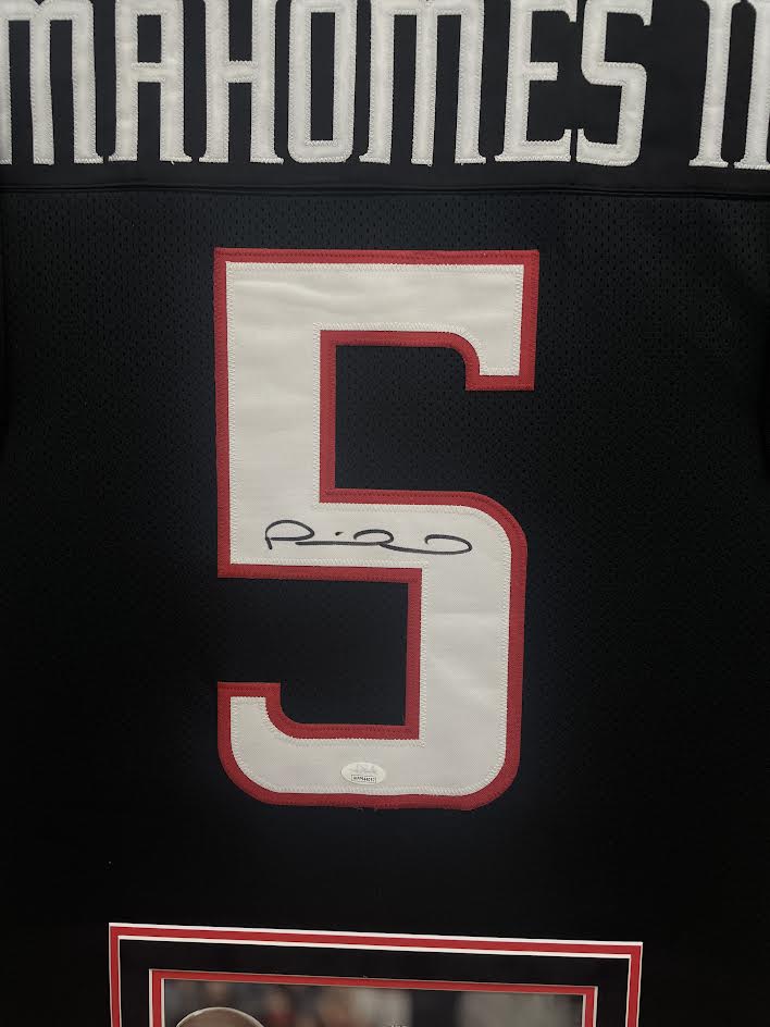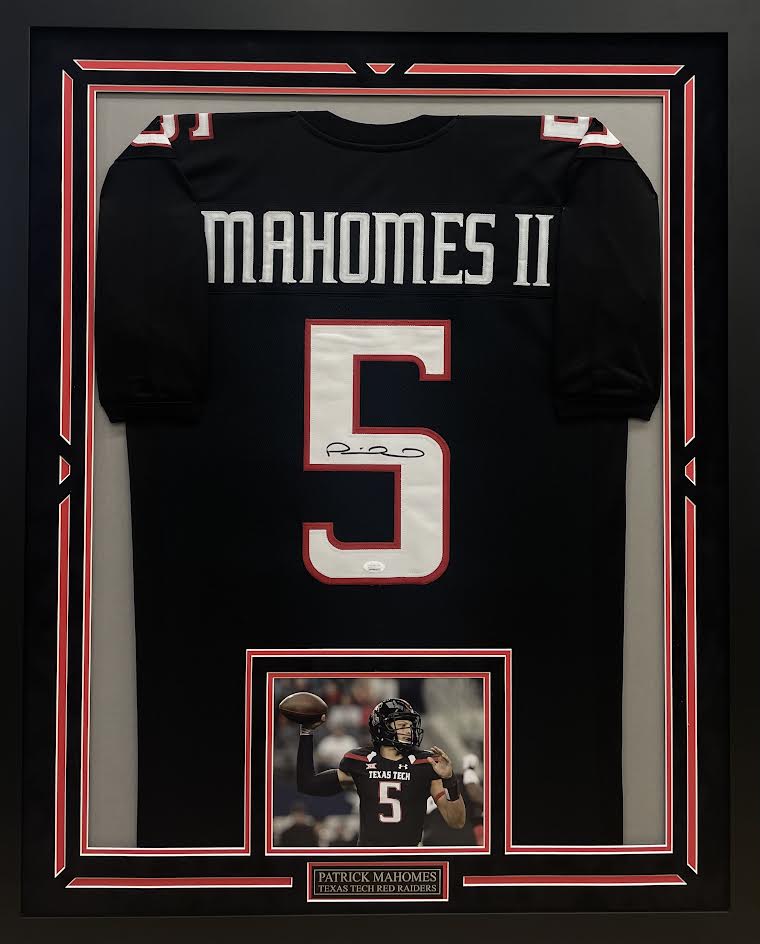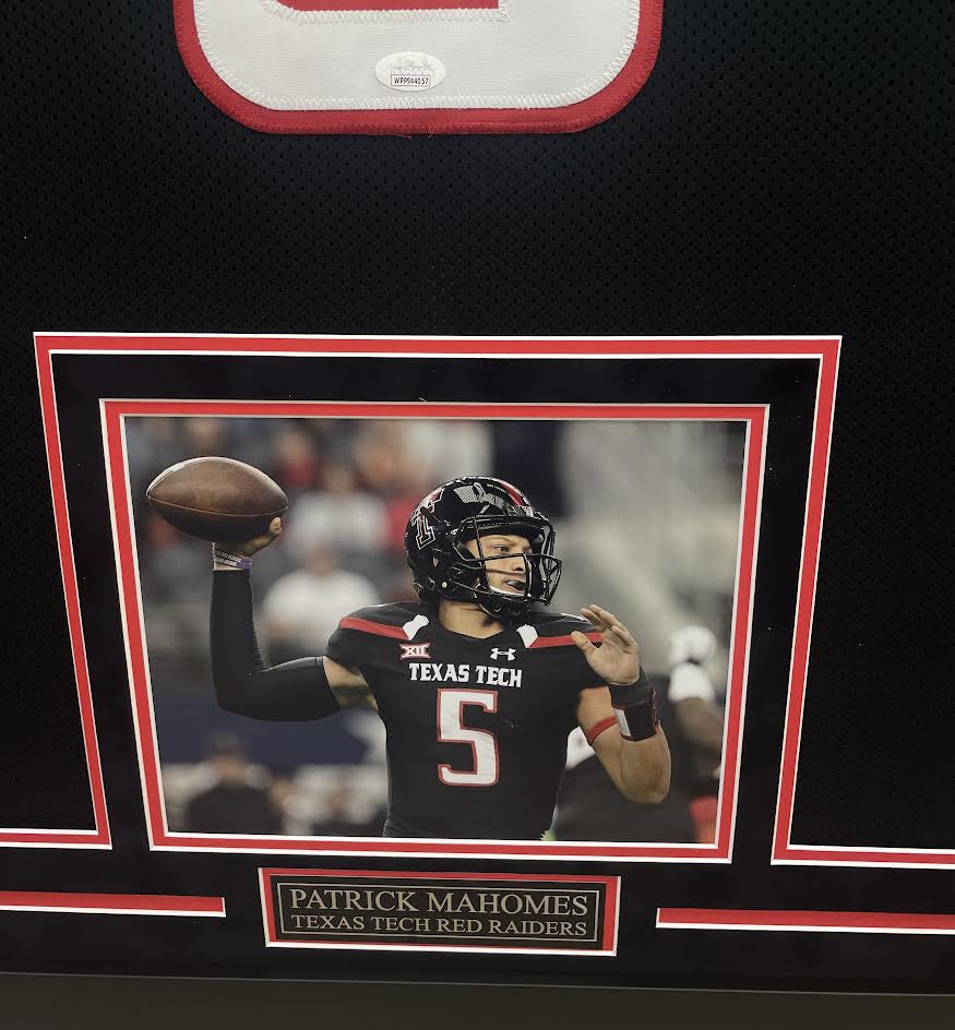 Patrick Mahomes Autographed Hand Signed Custom Framed Texas Tech Jersey, authenticated by JSA. This jersey is masterfully framed as the jersey is hand sewn rather than glued or stapled to ensure the jersey is not damaged in any way during the framing process. All of our materials are museum quality and acid free, not just cheap acid buffered paper matting. The suede matting, color combo, and white bevels really make this jersey POP like few jersey framings do! Feel free to reach out with any questions!