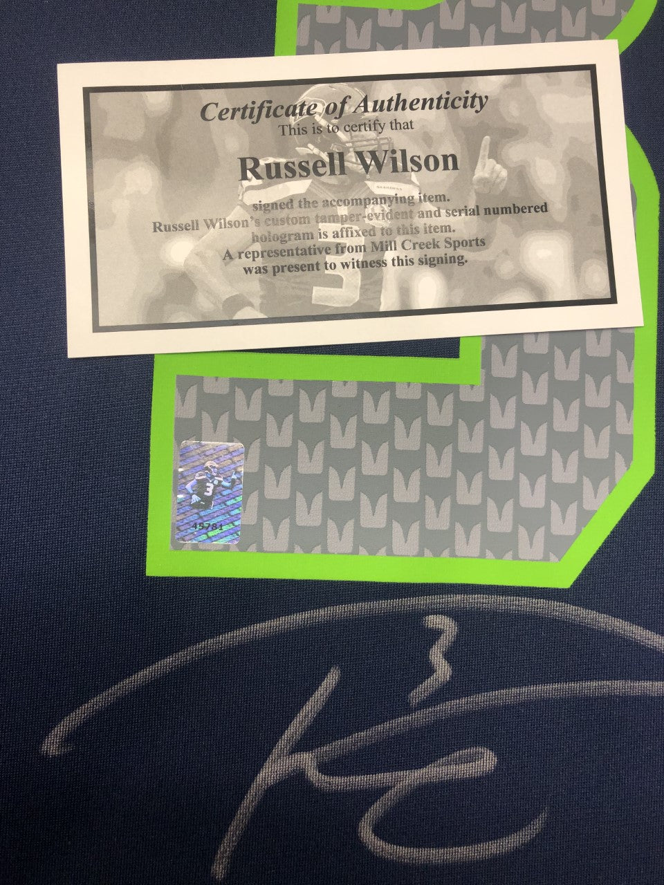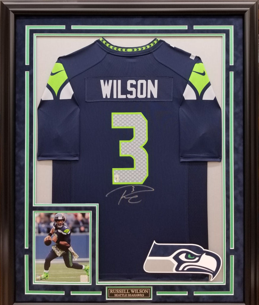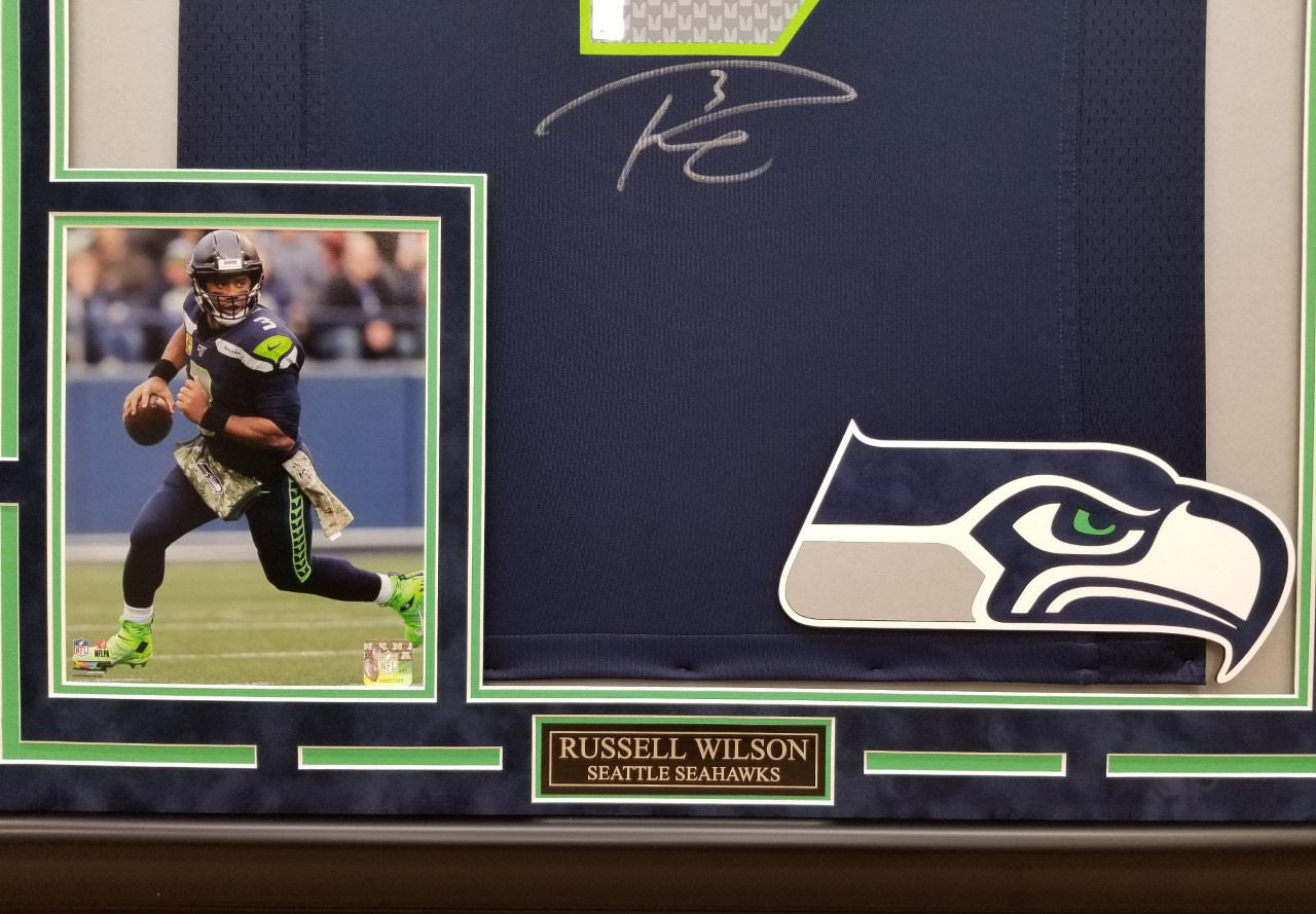 Russell Wilson Autographed Hand Signed Custom Framed Seattle Seahawks Jersey. This jersey is masterfully framed as the jersey is hand sewn rather than glued or stapled to ensure the jersey is not damaged in any way during the framing process. All of our materials are museum quality and acid free, not just cheap acid buffered paper matting. The suede matting, color combo, and white bevels really make this jersey POP like few jersey framings do! Feel free to reach out with any questions!