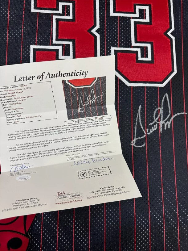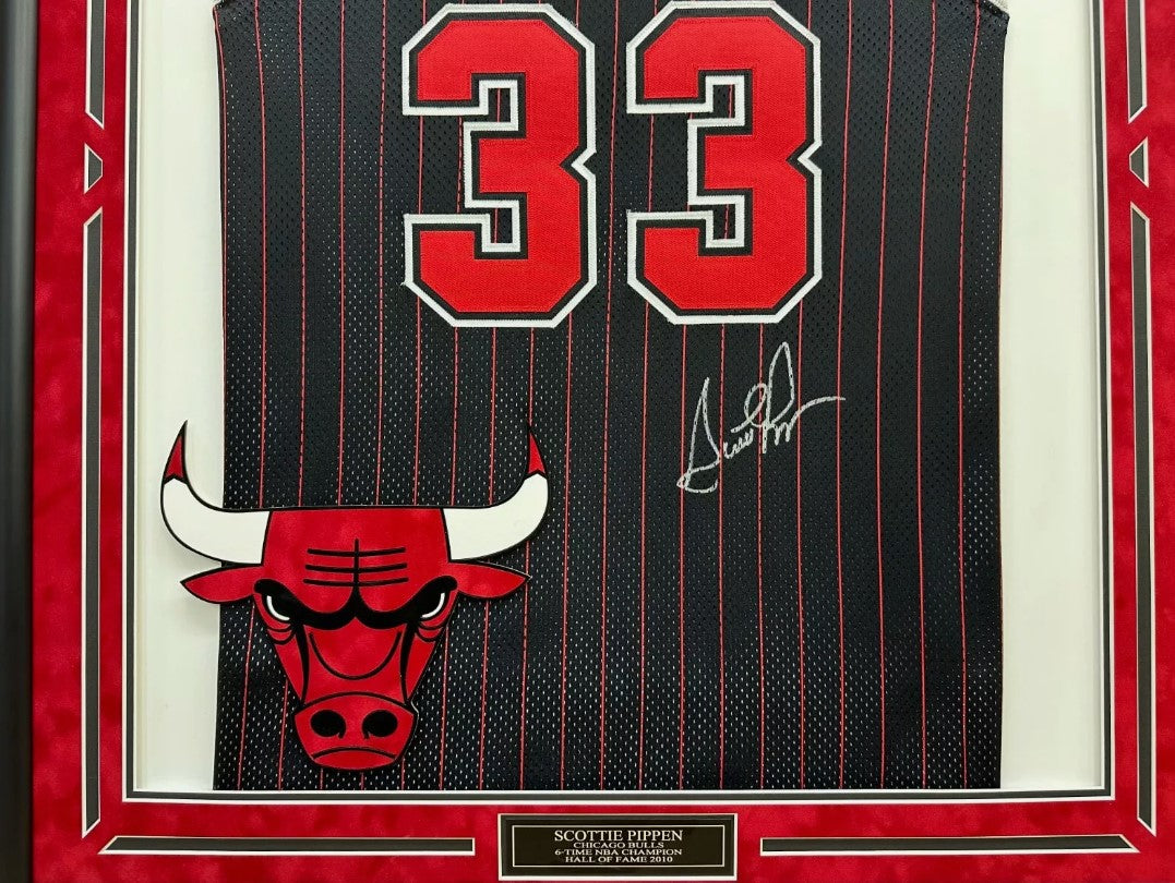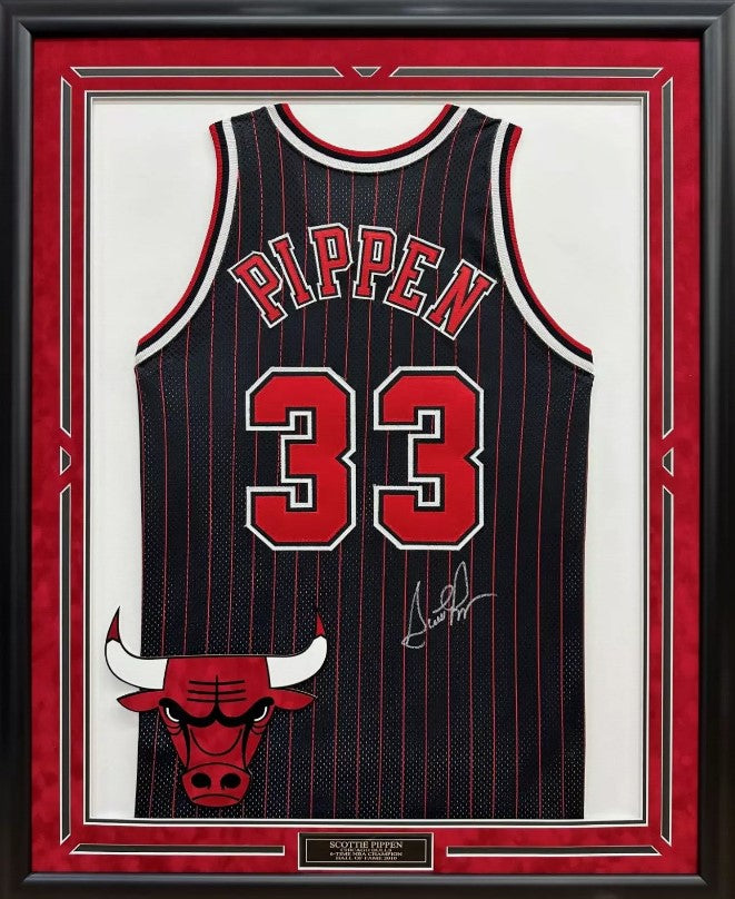 Scottie Pippen Autographed Hand Signed Custom Framed Black Chicago Bulls Jersey, authenticated by JSA. This jersey is masterfully framed as the jersey is hand sewn rather than glued or stapled to ensure the jersey is not damaged in any way during the framing process. All of our materials are museum quality and acid free, not just cheap acid buffered paper matting. The suede matting, color combo, and white bevels really make this jersey POP like few jersey framings do! Feel free to reach out with any questions!