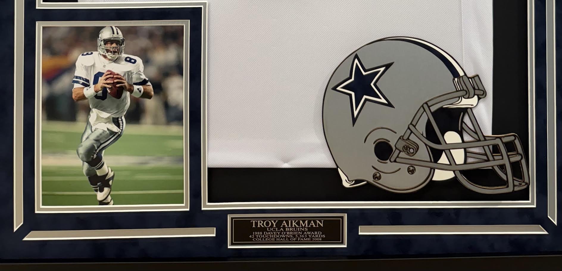 Troy Aikman Autographed Hand Signed Custom Framed Dallas Cowboys Jersey, authenticated by JSA. This jersey is masterfully framed as the jersey is hand sewn rather than glued or stapled to ensure the jersey is not damaged in any way during the framing process. All of our materials are museum quality and acid free, not just cheap acid buffered paper matting. The suede matting, color combo, and white bevels really make this jersey POP like few jersey framings do! Feel free to reach out with any questions!