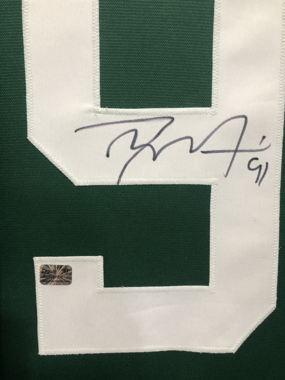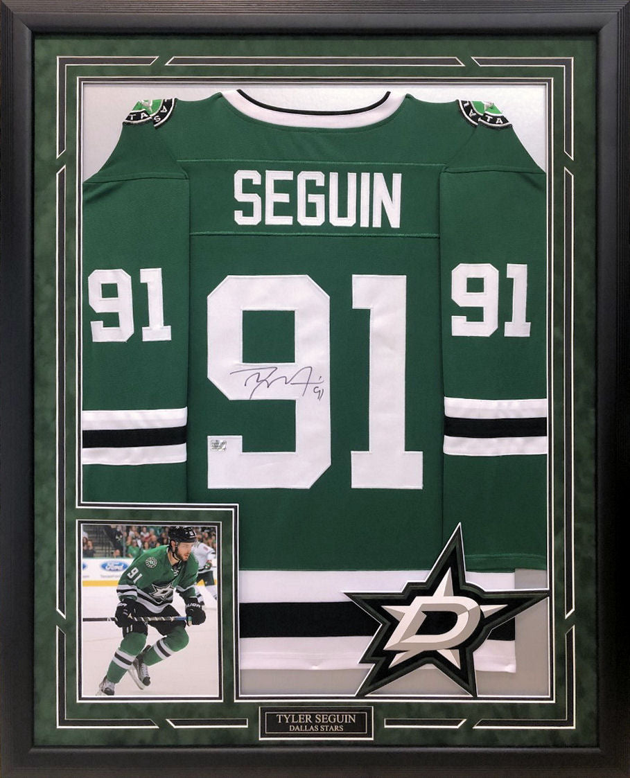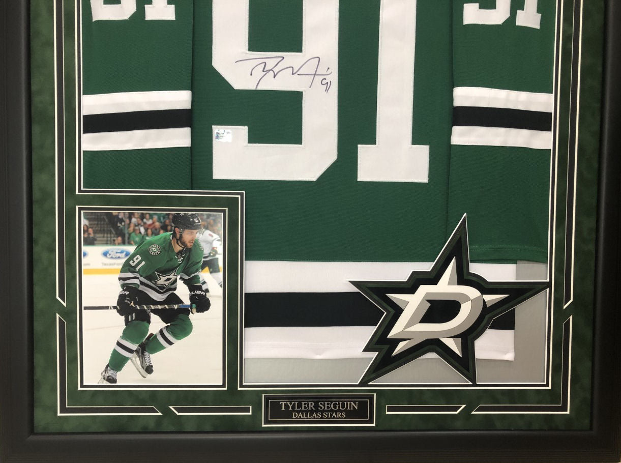 Tyler Seguin Autographed Hand Signed Custom Framed Dallas Stars Jersey. This jersey is masterfully framed as the jersey is hand sewn rather than glued or stapled to ensure the jersey is not damaged in any way during the framing process. All of our materials are museum quality and acid free, not just cheap acid buffered paper matting. The suede matting, color combo, and white bevels really make this jersey POP like few jersey framings do! Feel free to reach out with any questions!