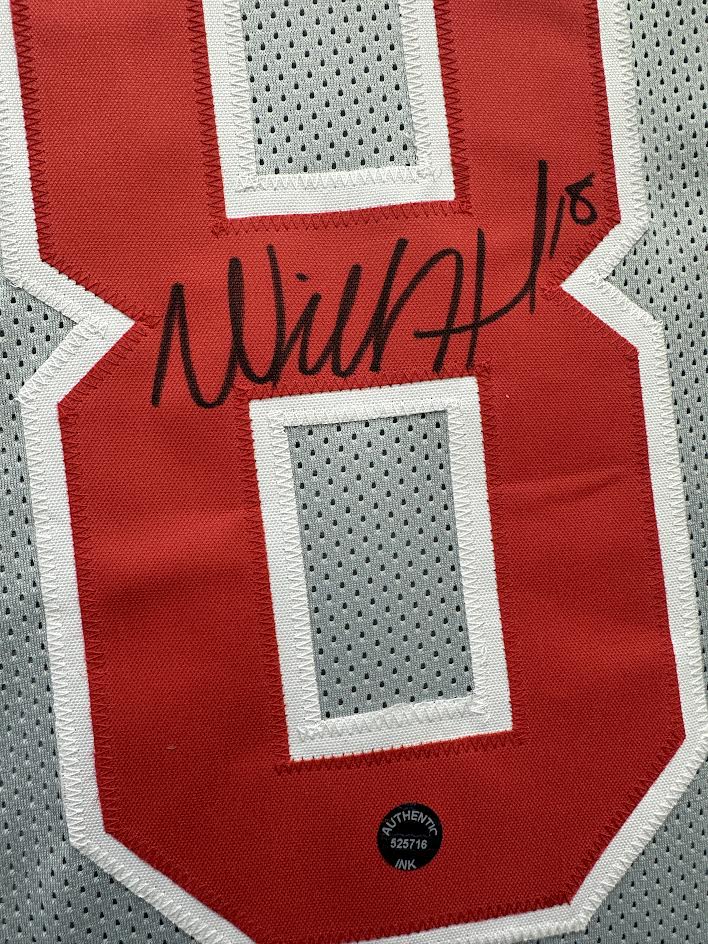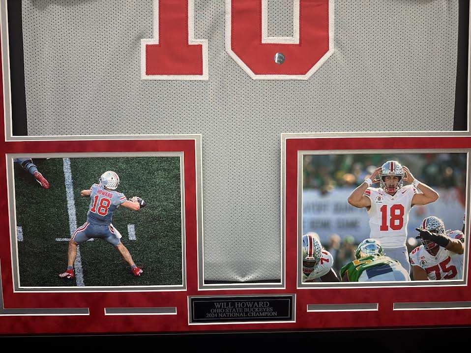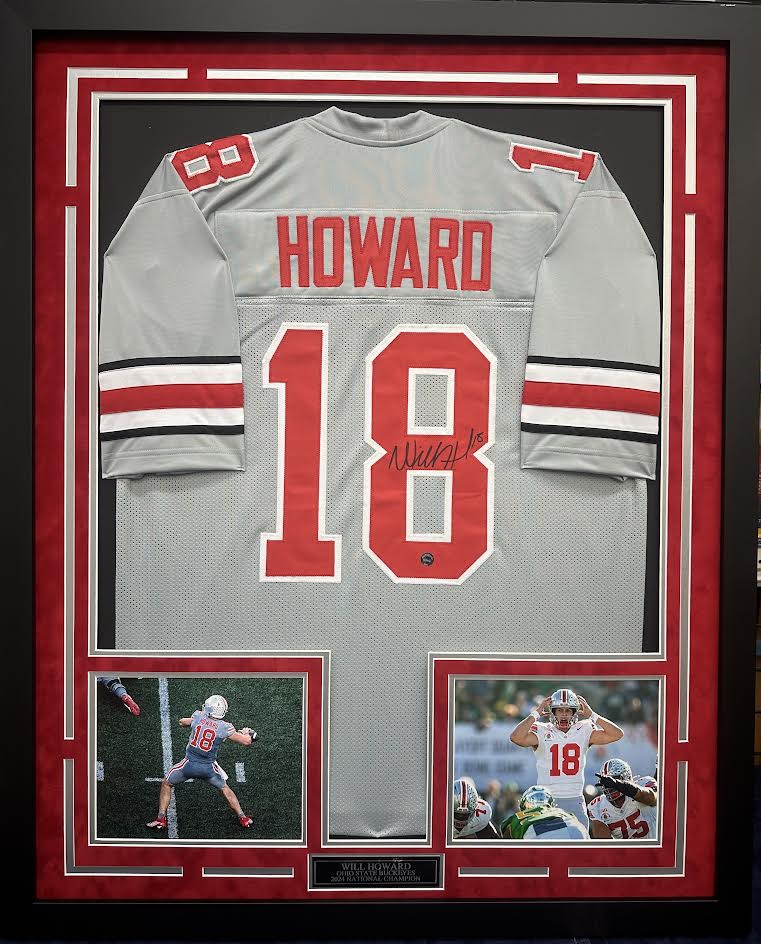 Will Howard Autographed Hand Signed Custom Framed Ohio State Jersey, authenticated by Authentic Ink. This jersey is masterfully framed as the jersey is hand sewn rather than glued or stapled to ensure the jersey is not damaged in any way during the framing process. All of our materials are museum quality and acid free, not just cheap acid buffered paper matting. The suede matting, color combo, and white bevels really make this jersey POP like few jersey framings do! Feel free to reach out with any questions!